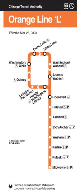 Si tu vuelo llega al aeropuerto de Midway este será el tren que deberás coger para llegar al centro de la ciudad. El precio del billete es de 5$. Es la forma más económica y fácil para llegar al centro. El horario de circulación es de 4 am a 1 am.