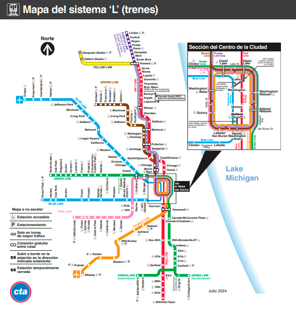 Aquí tienes el mapa y pases de la red de transporte público en Chicago.
