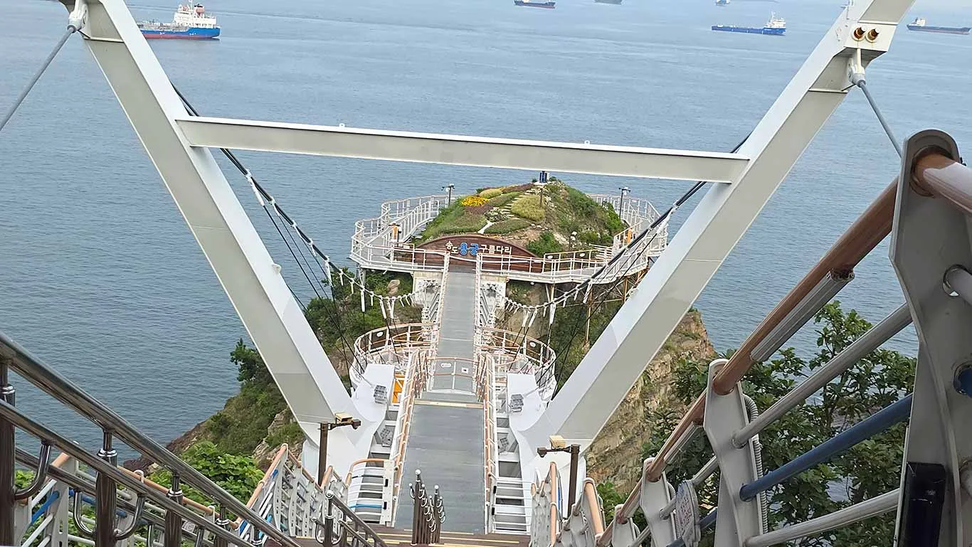 Aunque hemos escogido el billete de ida y vuelta, nos bajamos en la parada del Songdo Sky Park. Es la única parada que hace en el trayecto, y es aquí donde pasaremos un buen rato, ya que hay muchos puntos de interés que visitar, entre ellos los más destacados el mirador Sky Harbor Observatory y el puente en suspensión Songdo Yonggung (los lunes este puente permanece cerrado).